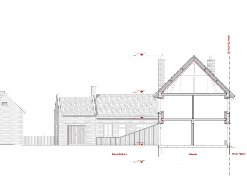 Le projet est un exercice délicat de conciliation de la qualité d’usage des communs avec les contraintes d’efficacité de la circulation, de l’entretien des bureaux et des équipements et du respect du secret professionnel. La cour est restituée à sa destination et à son ouverture première par des démolitions ciblées des ouvrages parasites : cages à oiseaux, murs de clôture, véranda. Afin de préserver les vues et les apports solaires, ces communs sont mutualisés entre les trois lots avec une servitude de vue, de passage et d’accès. Néanmoins, une articulation subtile de clairevoies et de portails à galandage structure les vues et canalise les flux afin d’éviter toute perturbation des usages projetés.