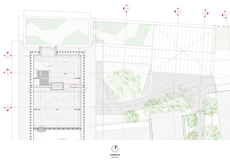Les communs sont restructurés pour accommoder de nouveaux usages. La salle d’attente du rez-de-chaussée s’élargit et s’ouvre sur un escalier spectaculaire, toute hauteur, desservant l’ensemble des niveaux de la maison paramédicale et autorisant son classement en ERP de 5e catégorie. La maison paramédicale est intégralement rénovée par une isolation biosourcée insufflée en vrac en caissons fermés en parois et rampants, incluant le remplacement de toutes les menuiseries et d’une nouvelle installation de chauffage, ventilation double-flux, électricité et eau chaude sanitaire.