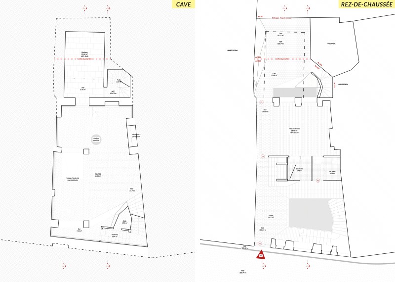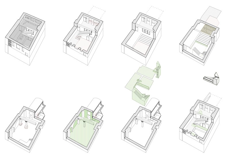 Face à la grande diversité des usages projetés - vernissages, conférences, projections, concerts, la restructuration prévoit une intervention minimale sur la cave, offrant une variété d’aménagements du volume. La salle de réunion et le bar disposent de cloisons modulaires qui autorisent une diversité d’usages et de configurations. Un accès à la cour intérieure est possible depuis le sous-sol et depuis le rez-de-chaussée, et ce sans perturber le déroulement de l’exposition ou de la réunion. En outre, le dispositif de chauffage du sous-sol autorise une utilisation transitoire avec des corps de chauffe électriques et une cheminée à foyer fermé avec tube isolé, ainsi qu’une utilisation plus durable avec un plancher chauffant en chape.