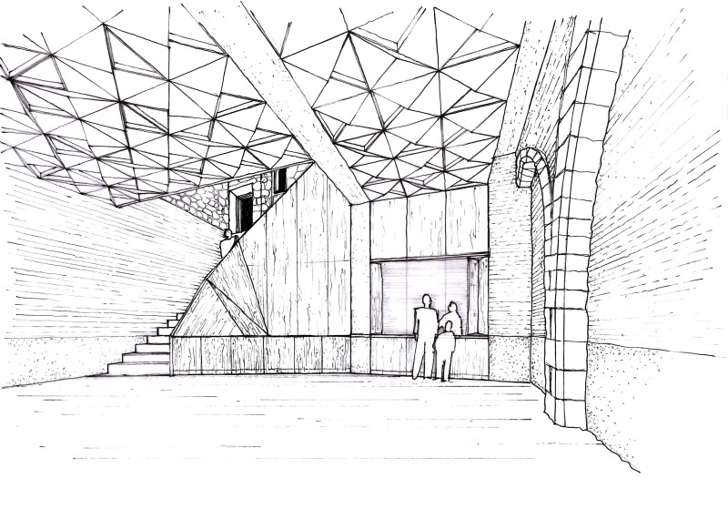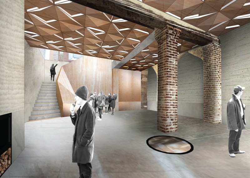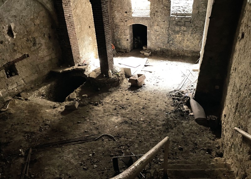 Le lieu est constitué d’un temps concaténé, concrétisé dans une accumulation en strates de débris d’époques révolues. Le plafond de la première cave, révélant les voûtes et le fond perdu du plancher collaborant, est noyé dans une pénombre qui n’est pas sans rappeler les mondes fantasmés du Piranèse. Le regard se perd dans la confusion des perspectives gauches des anciennes parois ; le plafond s’éloigne et s’efface jusqu’à devenir un paysage à contempler. Un monde souterrain, évasif, mystérieux, sans cesse découvert, toujours à explorer; une mise en scène du passage du temps et de la permanence du lieu, des galeries parcourant l’ensemble du territoire comme autant de rhizomes : une opportunité d’exprimer la raison d’être de l’architecture et du paysage sur le territoire de l’Aisne.