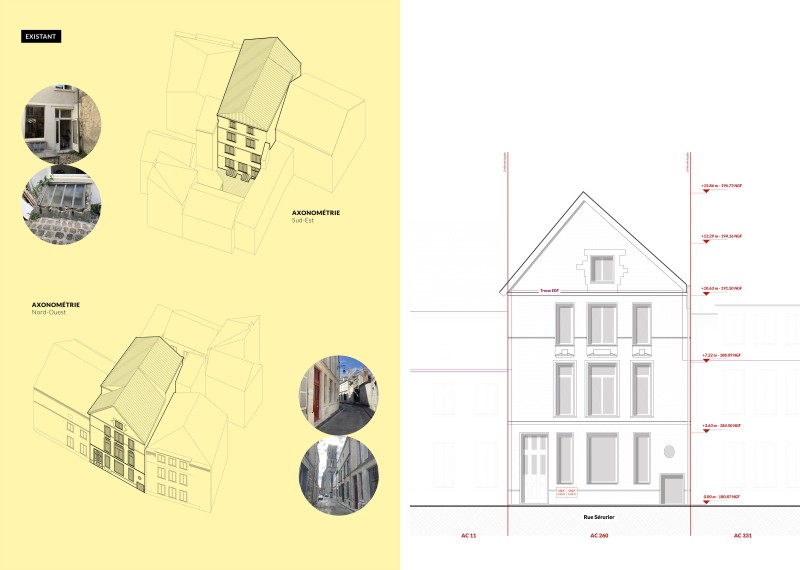 La composition du projet repose sur un dialogue entre des aménagements contemporains en bois et des revêtements en sol et parois présentant des aspérités, des contrastes, la trace des gestes ou du temps : béton de chanvre, enduit de terre crue, chape poncée laissant apparaître les granulats. La lumière naturelle et artificielle, essentiellement zénithale, soulignera toutes ces imperfections heureuses pour générer une ambiance chaleureuse et accueillante, unitaire, ponctuée de petits événements : une fenêtre de vérité sur le puits, une cheminée, un élément d’aménagement, une vue.