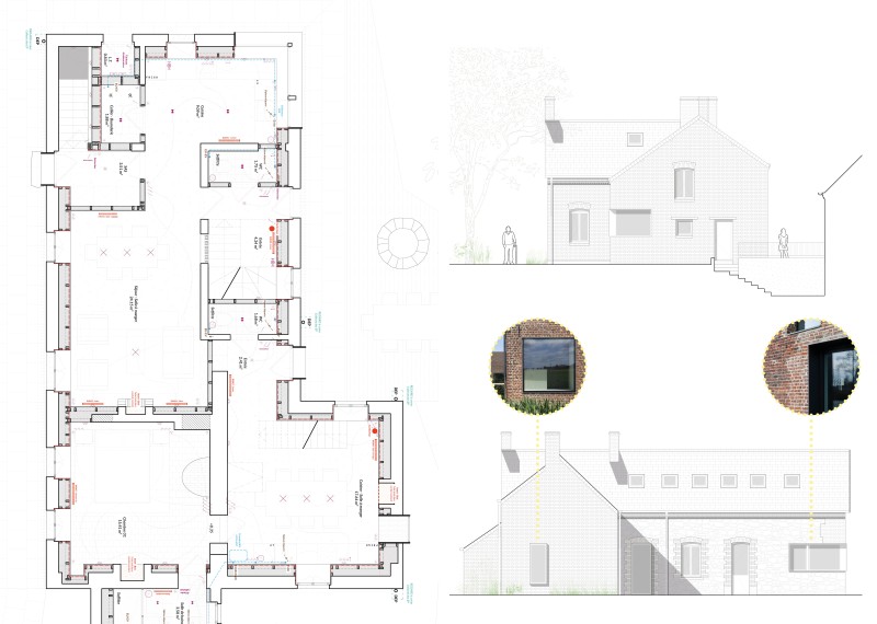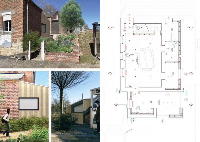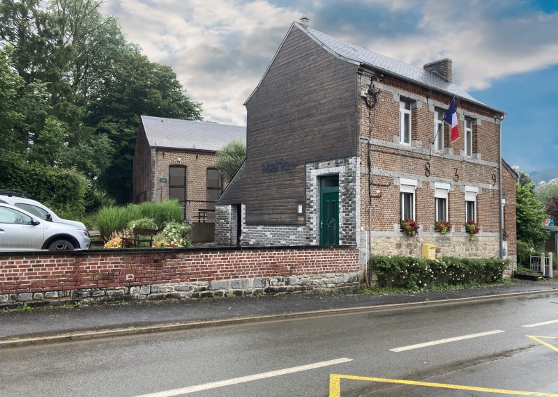 Les bâtisses, ordinaires, présentent les traceurs constructifs récurrents de l’Avesnois et des qualités architecturales réelles. Les épais murs de pierre et de brique de terre cuite, caractéristiques, sont mis en valeur par un contraste avec une composition contemporaine des extensions neuves, jouant de plis et de nuances de bardages et de pentes. Les baies sont ouvertes de sorte à créer autant de perspectives sur l’environnement et d’occasions de magnifier les maçonneries.