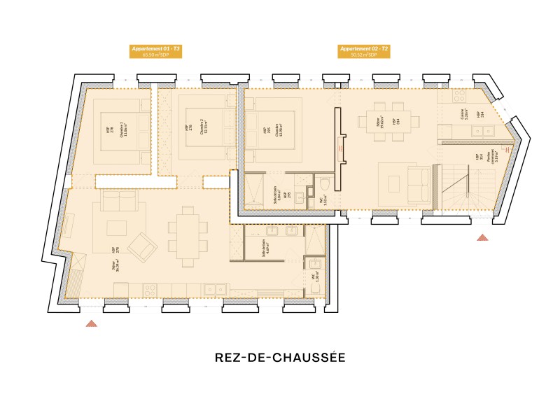 La distribution des logements est structurée autour de la cage d’escalier historique, rénovée et doublée d’une colonne pour l’acheminement des réseaux.