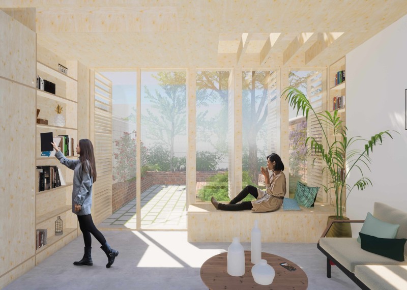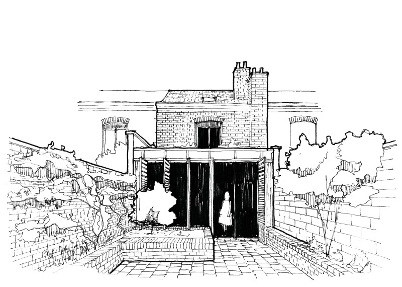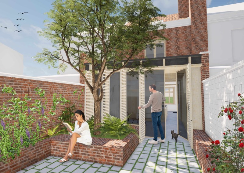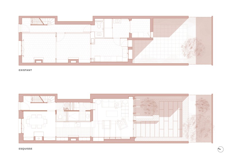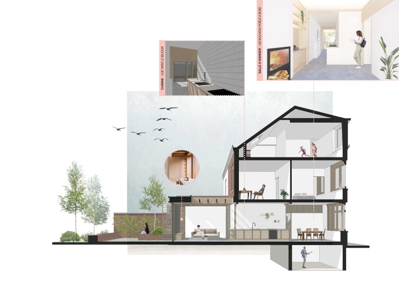 Le rez-de-chaussée est le nœud de l’articulation des espaces de vie des habitations ouvrières, exposant souvent des espaces nécessitant une intimité au regard des passants dans la rue. Le projet prévoit la réhabilitation du rez-de-chaussée pour placer la cuisine à l’interface entre la salle à manger sur la rue et le séjour, largement ouvert sur la cour. L’armoire murale est ainsi intégrée dans des usages contemporains, et le séjour est intimisé avec plus d’efficacité.