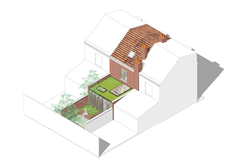 Inscrite dans un rang régulier et cohérent, en retrait de la rue Roger Salengro, axe principal traversant d’Hellemmes, l’habitation bénéficie du calme de sa localisation sans se départir d’un contexte attractif. Néanmoins, l’étroitesse de la parcelle, l’inconfort hivernal et estival et la fonctionnalité médiocre du rez-de-chaussée a incité à rechercher une restructuration globale.