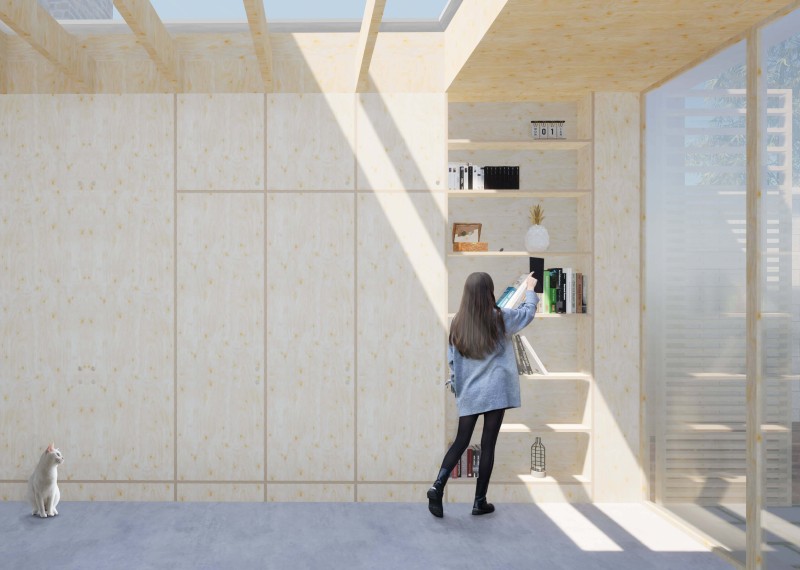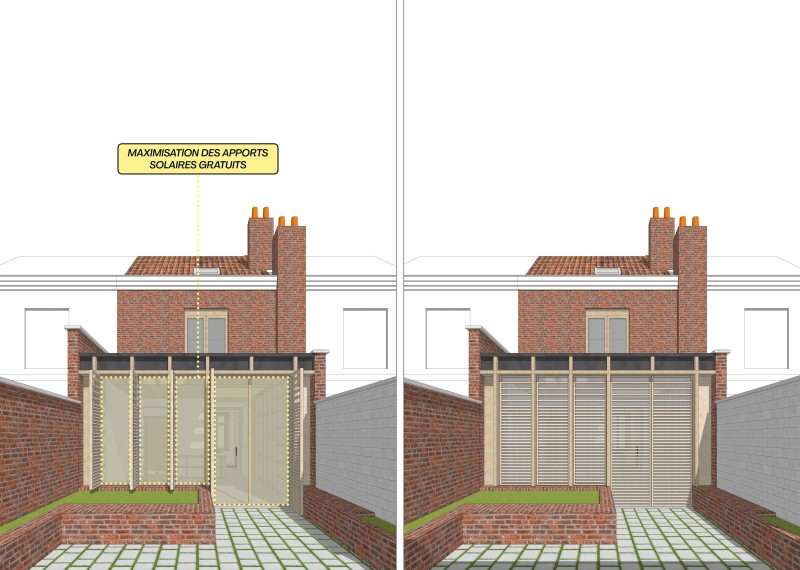 Une rénovation globale est projetée, comprenant notamment l’isolation thermique des parois, le contrôle des points singuliers d’’étanchéité à l’air et le remplacement des baies. L’extension est réalisée en ossature bois, après démolition de l’extension actuelle. Des puits de lumière sont disposés de sorte à amener une lumière naturelle suffisante jusque dans la cuisine. Des volets extérieurs, réalisés sur mesure et fixés aux épines autorisent de réguler les apports solaires en été.
