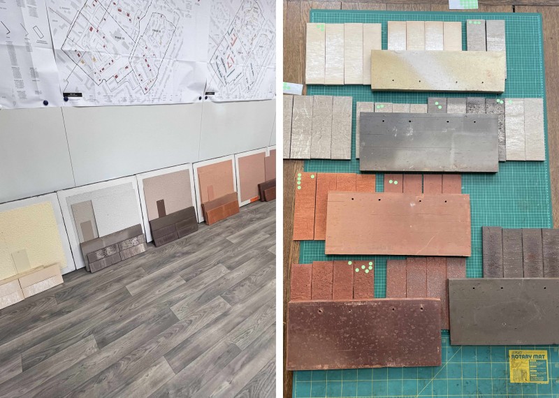 Répondant à la nécessité d’intégrer les éléments techniques dans la façade des logements réhabilités, une tuile spécifique est proposée. Une minéralité mate, travaillée, nuancée mais affirmée est ainsi obtenue. Cette vêture sobre et subtile est associée à un aluminium laqué anthracite, matériau unitaire qui assure la cohésion de chaque nuance de plaquette dans le rang. La diversité et les nuances de teinte introduisent néanmoins un séquençage vertical qui préserve la cohérence de la bande mais rompt la répétitivité des habitations, pour une appropriation aisée du logement.