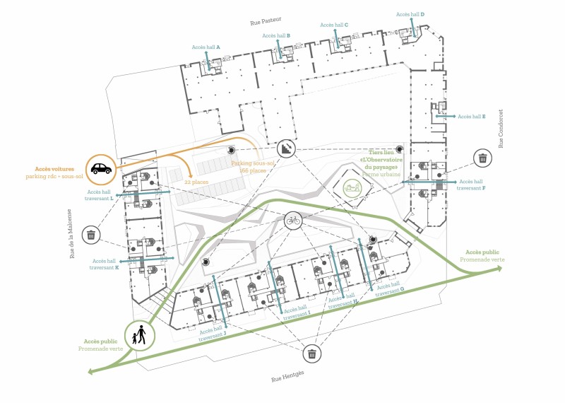 - Une diversité programmatique, avec une forme de mixité organisée sur les rues Pasteur et Condorcet; les entrées sont invisibilisées.