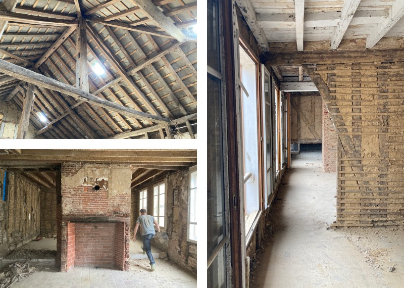 Ainsi, après un curage exhaustif du second-œuvre, une campagne généralisée de reprises du pan de bois est projetée, avec la réfection et le confortement ponctuel des planchers endommagés ou sous-dimensionnés. Chaque montant, chaque écharpe, chaque appui a fait l’objet de sondages et de contrôles. Lorsque leur enlèvement s’avère nécessaire, les torchis sont démontés et stockés en prévision de leur mise en œuvre en auto-construction accompagnée. La synthèse, à la fois technique et sensible, pilotée par l’architecte, permet de fiabiliser les partis pris.