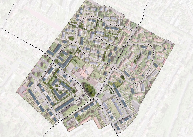 Le quartier de Beaumont se déploie en quatre cités articulées autour d’un plateau d’équipements (l’église et son verger, un centre socio-culturel, un béguinage) traversé par le boulevard Gorghemetz, marqueur territorial de la Ville d’Hem, et lieu d’expression privilégié de chaque cité. La spécificité de cette structure découle d’un développement morcelé et sensible qui a dicté les enjeux urbains, paysagers et architecturaux du projet de rénovation.