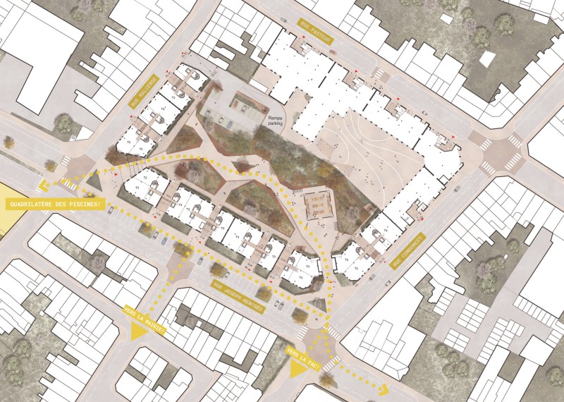 - Une diversité programmatique, avec une forme de mixité organisée sur les rues Pasteur et Condorcet; les entrées sont invisibilisées.
